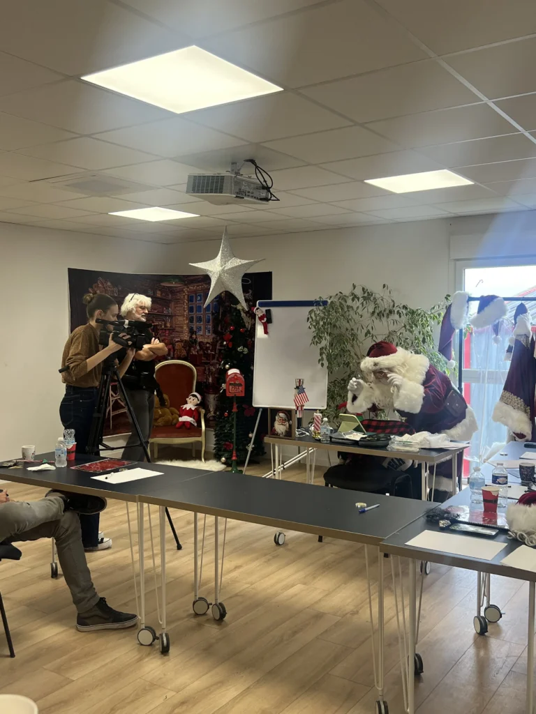 Dès l’ouverture des portes, l’atmosphère s’est installée : rires, regards d’émerveillement, costumes choisis, accessoires affinés. Nos stagiaires ont pu vivre l’univers du Père Noël dans toute sa profondeur : posture, voix, regard, improvisation. Santa Chris a partagé ses anecdotes : de la ceinture ornée des neuf rennes, aux petits instants suspendus quand un enfant lui confie un secret. Santa Chris by My Happy Company